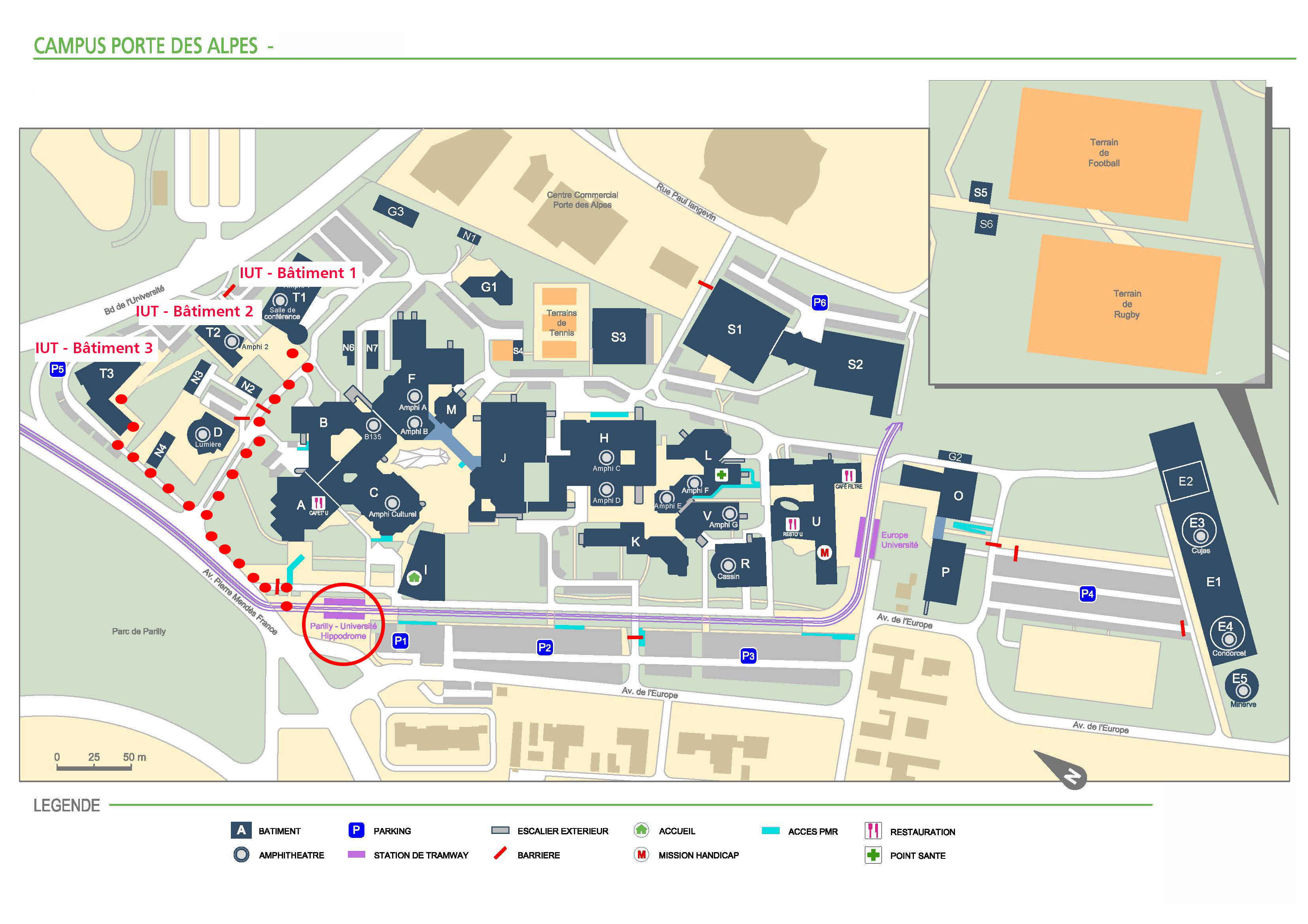 En raison de travaux sur les voiries, l'Avenue de l'Europe est fermée à la circulation. Le stationnement est possible uniquement sur les parkings P4 et P6 et le parking de l'hippodrome de Parilly. Il est formellement interdit de se garer sur le parking situé 160 boulevard de l’université à Bron.