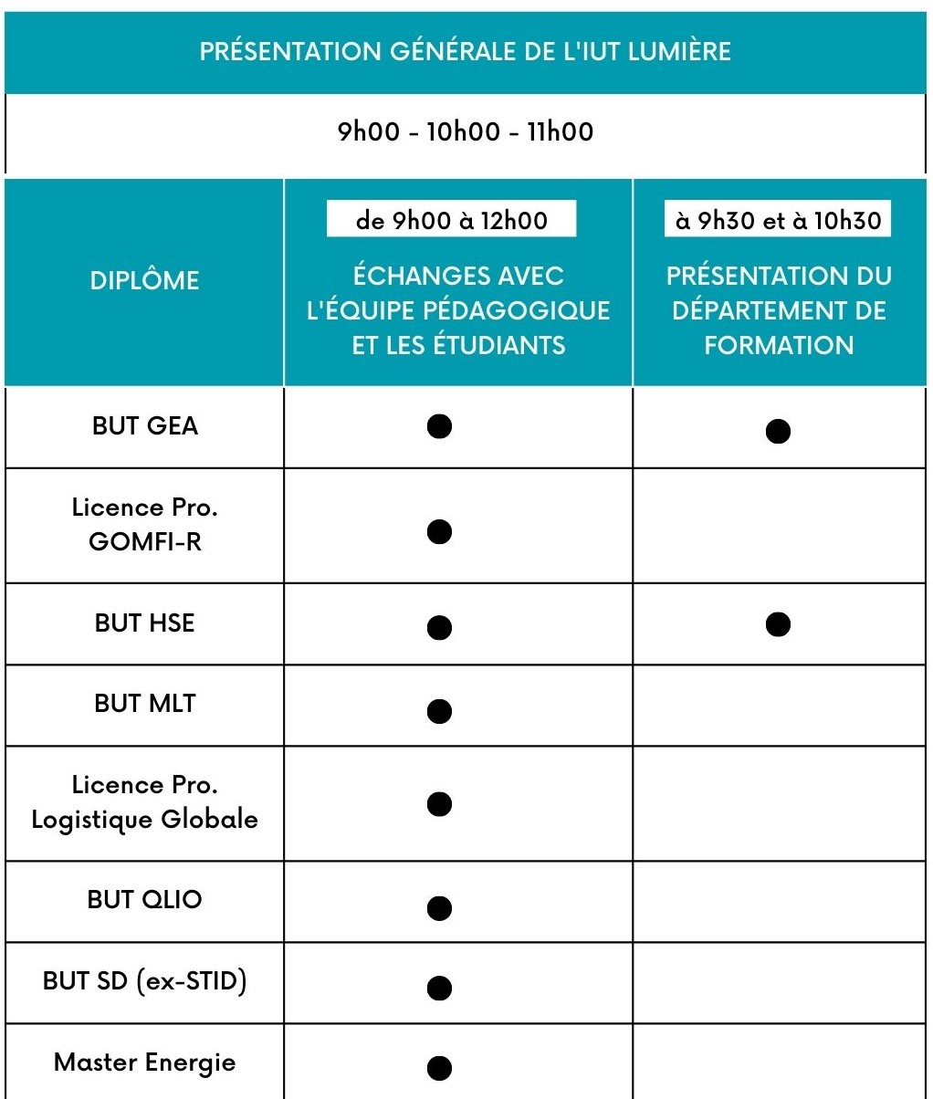 Visualiser le programme de la Journée Portes OuvertesPrésentation générale de l’IUT Lumière par la direction de l'IUT : présentation de l'IUT, de l'offre de formation, du fonctionnement de l'alternance, ...