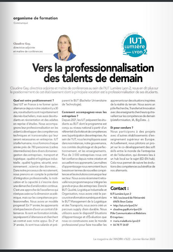 Zoom sur l'interview de Claudine Gay, Directrice de l'IUT Lumière pour le Magazine de l'ANDRH (Association Nationale des DRH) intitulée "Vers la professionnalisation des talents de demain".