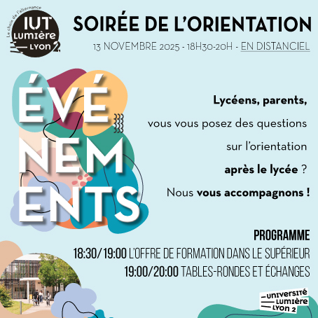 Pour bien choisir votre parcours, participez à notre Soirée de l’Orientation en ligne et découvrez, avec l’équipe pédagogique de l’IUT Lumière Lyon 2, les spécificités et différences entre ces formations. !